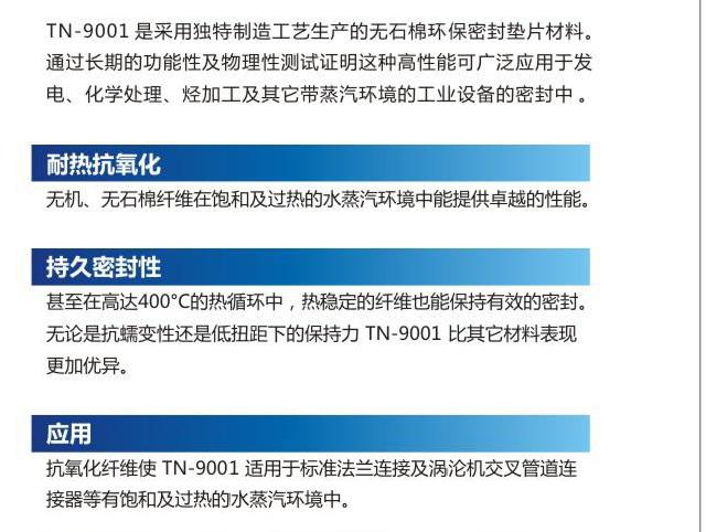TN-9001是采用獨(dú)特制造工藝生產(chǎn)的無石棉環(huán)保密封墊片材料,通過長期的功能性與物理性測(cè)試證明這種高性能可廣泛應(yīng)用于發(fā)電、化學(xué)處理、烴加工及其它蒸汽環(huán)境的工業(yè)設(shè)備的密封中。