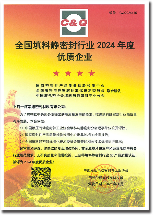 上海一柯索拓密封材料有限公司榮膺"全國填料靜密封行業(yè)2024年度優(yōu)質(zhì)企業(yè)"稱號(hào),以創(chuàng)新密封技術(shù)驅(qū)動(dòng)產(chǎn)業(yè)未來。
