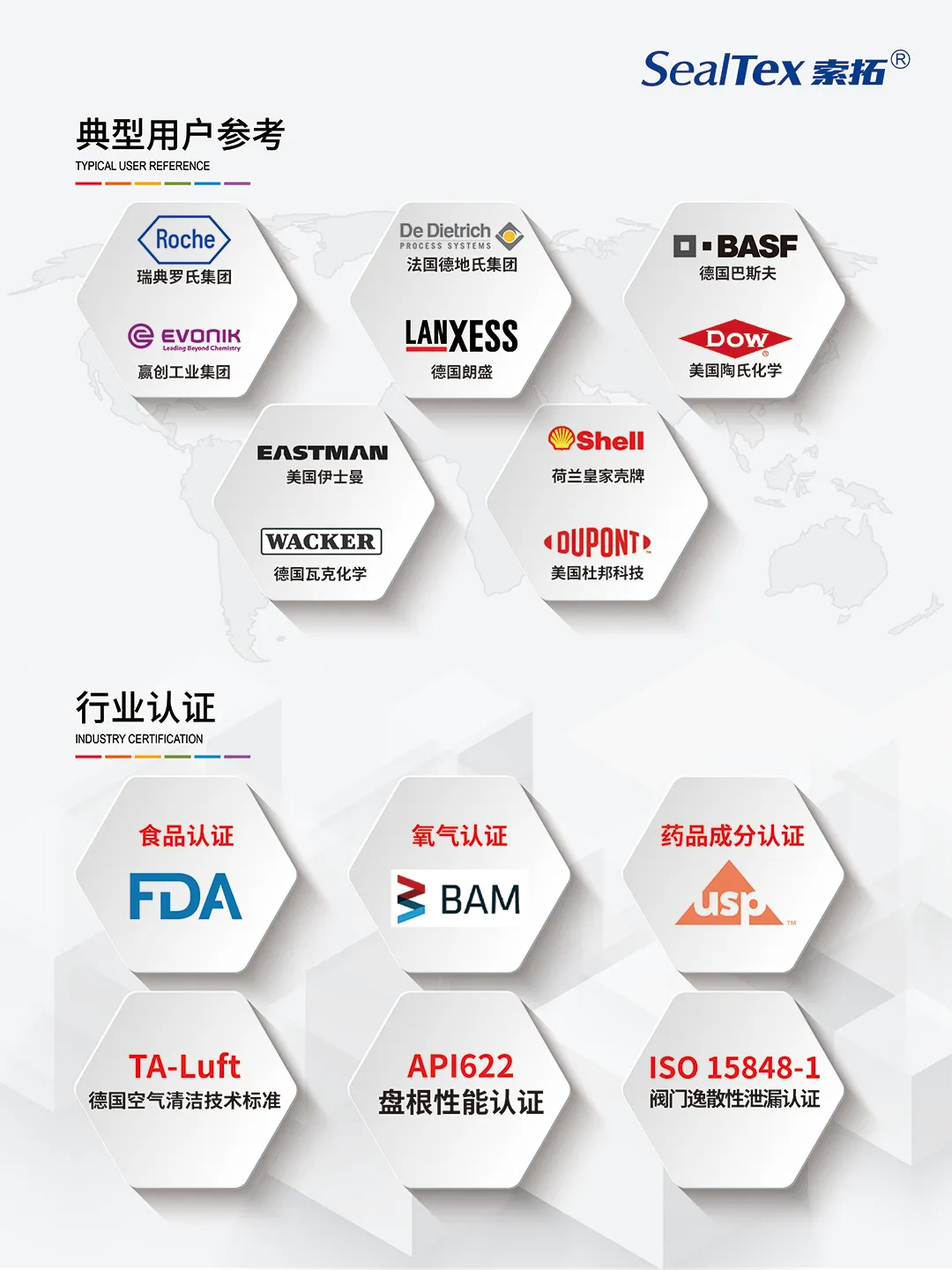 我司代理合作品牌TEADIT泰迪已為全球多家知名化工企業(yè)提供密封解決方案服務,例如:BASF巴斯夫、Shell殼牌、Roche羅氏等。且產品可滿足FDA、BAM、DVGW、ups、TA-Luft、API622、ISO 15848-1等不同標準要求。還在耐高溫、耐腐蝕等性能上表現(xiàn)出色,能夠滿足天然氣、石油、化工等嚴苛工況下的密封需求